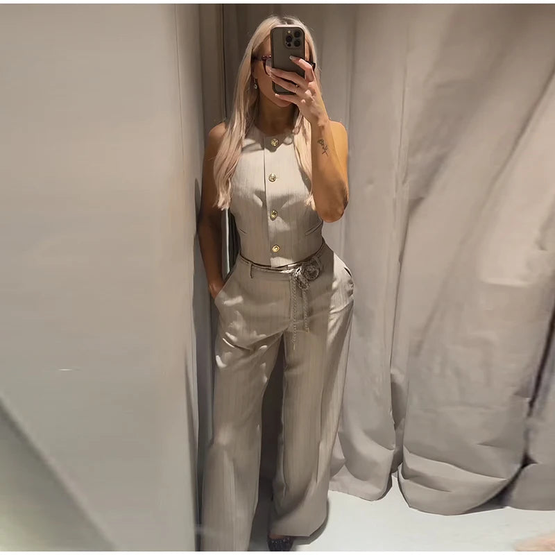 Step into 2026 with confidence in this chic and modern two-piece women’s suit set. Designed for the fashion-forward woman, this outfit features a sleek sleeveless tank vest adorned with elegant metal button details, perfectly paired with flattering high-waisted belted wide-leg trousers.